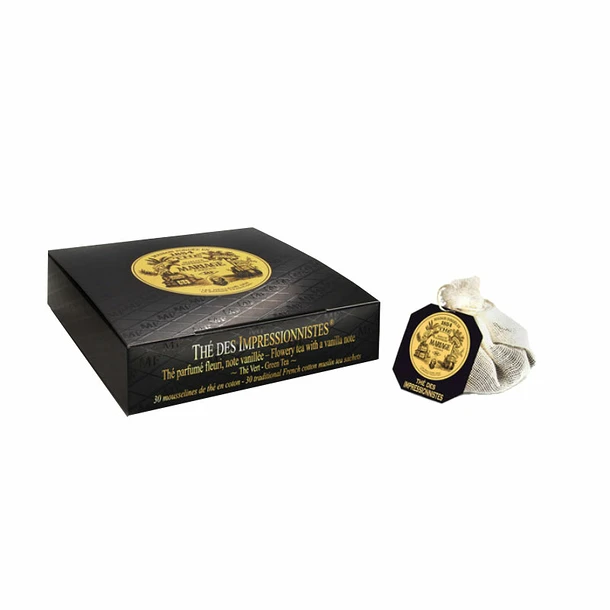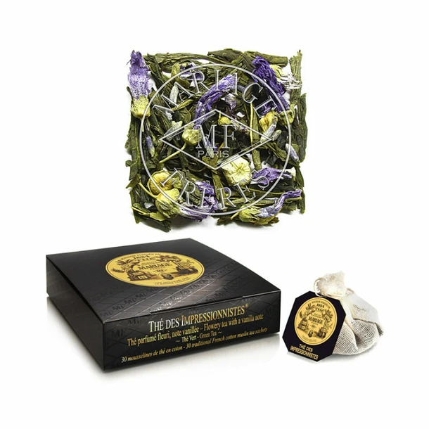 Ce thé vert parfumé d’épices douces et de fleurs blanches est parsemé de pétales de mauve qui évoquent les ciels indigo des impressionnistes.