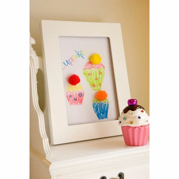 Cadre épuré sans verre pour dessins au format A4. Laissez libre cours à la créativité de votre enfant et créez une galerie avec ses jolis dessins au mur. Le cadre en bois blanc est doté d’un support mural pratique et peut être suspendu de façon verticale ou horizontale. Le cadre a de la place pour un dessin au format A4, qui peut facilement être remplacé au fur et à mesure que l’enfant créé de nouvelles peintures.