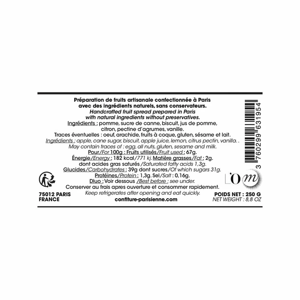 Pomme de Charente Maritime, sucre de canne, biscuit, jus de pomme, citron, pectine d’agrumes et vanille