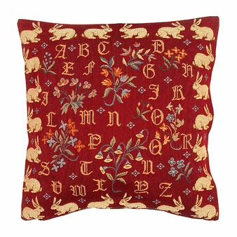 Cette housse de coussin Dagobert est un abécédaire dans un style Moyen Âge avec ses petites fleurs et lapins très présents sur les tapisseries anciennes.