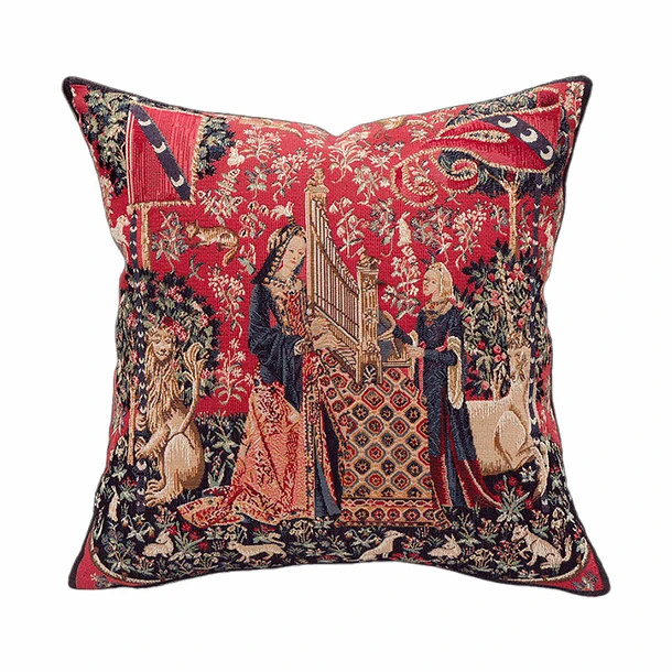 La série de tapisseries Dame à la licorne est composée de 6 modèles représentant les cinq sens et la sixième pourrait désigner le libre-arbitre. D’un rouge vif, le dessin est composé d’une scène et d’un fond « millefleurs » caractérisé par une flore abondante et peuplé d’un bestiaire.