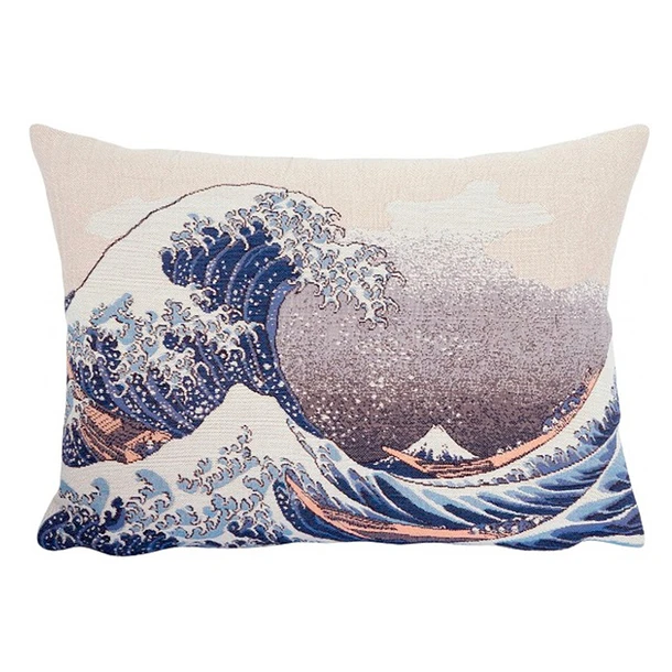 Housse de coussin en lin et coton, réalisée d’après l’estampe « Sous la grande vague au large de la côte de Kanagawa ».