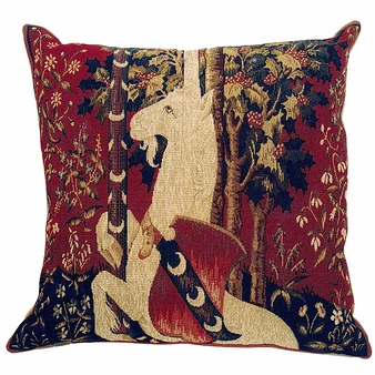 Cette housse de coussin est une inspiration médiévale dans le style des tapisseries de la « Dame à la licorne » exposées au musée de Cluny. Osez l’histoire dans votre salon !