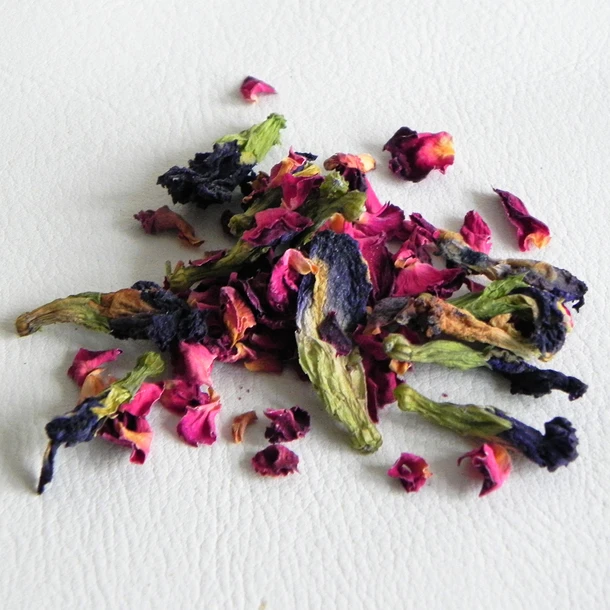 Ingrédients : fleurs de pois bleus, pétales de rose