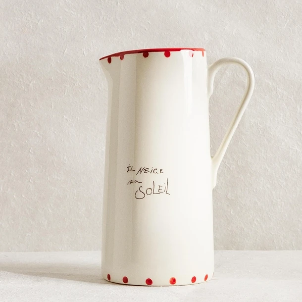 Pichet en faïence orné de détails contrastants et dont le motif est inspiré des manuscrits de Pablo Picasso (1881-1973).