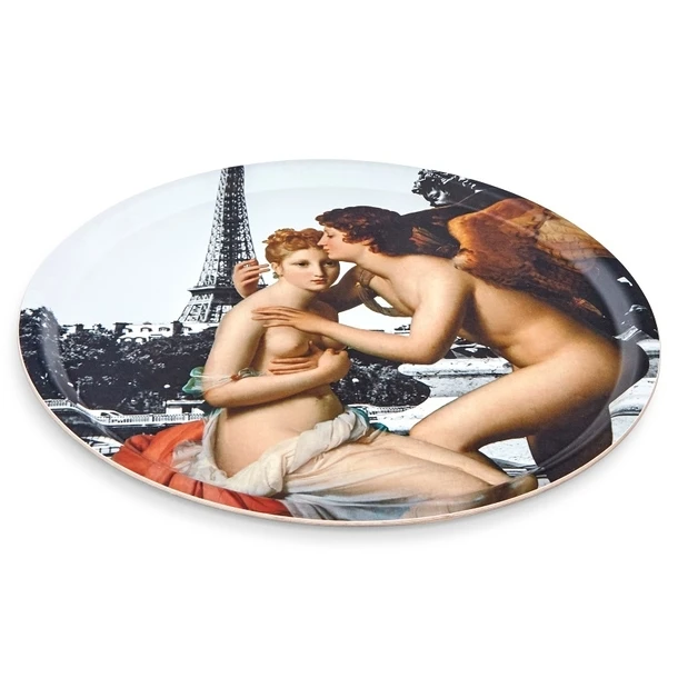 Sur ce plateau en laminé de bouleau sont repris les personnages du tableau : la princesse Psyché et Cupidon (l’Amour). Dans le tableau, la jeune femme est surprise par le baiser de ce dernier qu’elle ne voit pas.