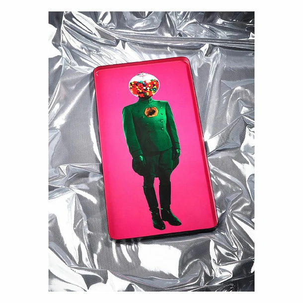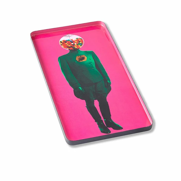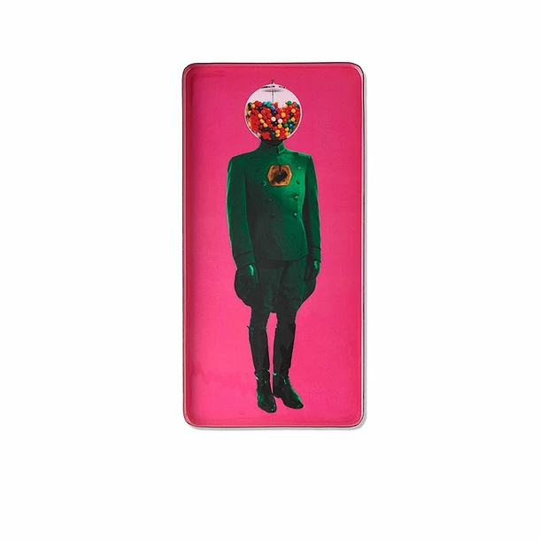 Plateau rectangulaire décoratif verni avec un homme à tête de bonbonnière, fabriqué à la main par Ganzaï.