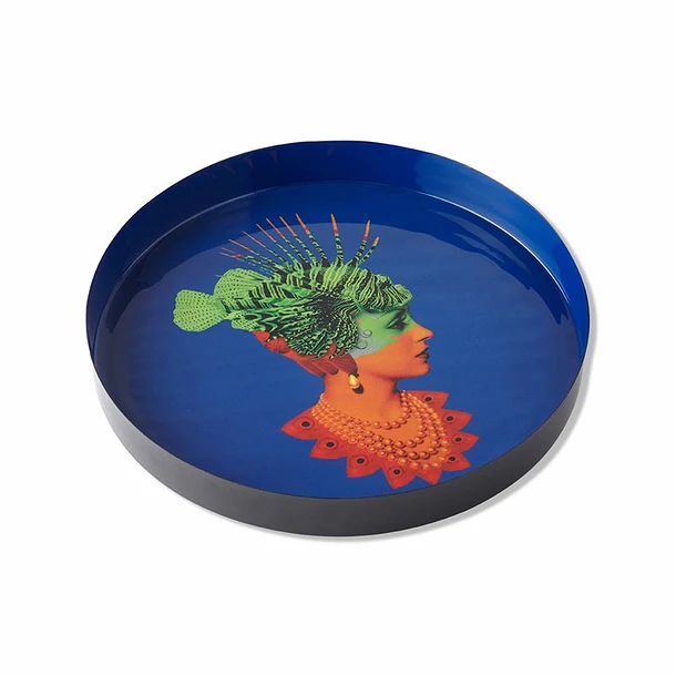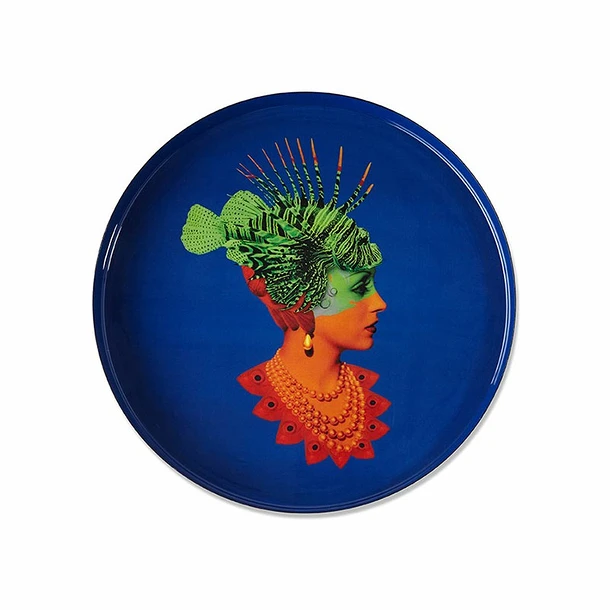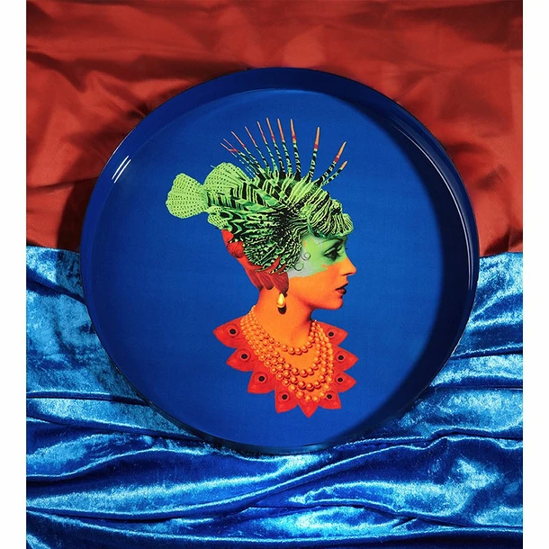 Plateau rond décoratif verni avec une femme à tête de poisson rascasse, fabriqué à la main par Ganzaï.