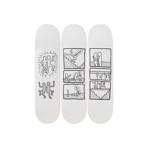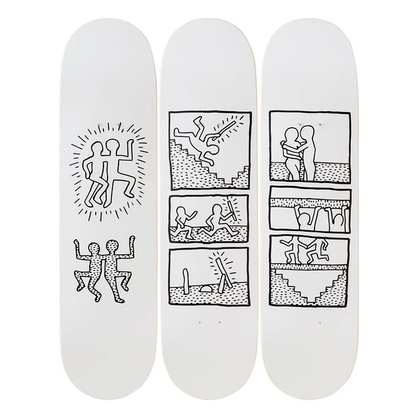 Ce triptyque de skateboards Keith Haring est aussi décoratif que fonctionnel. Les skateboards peuvent être posés ou accrochés au mur, mais aussi ornés de roues et ainsi retrouver leur fonction originelle.