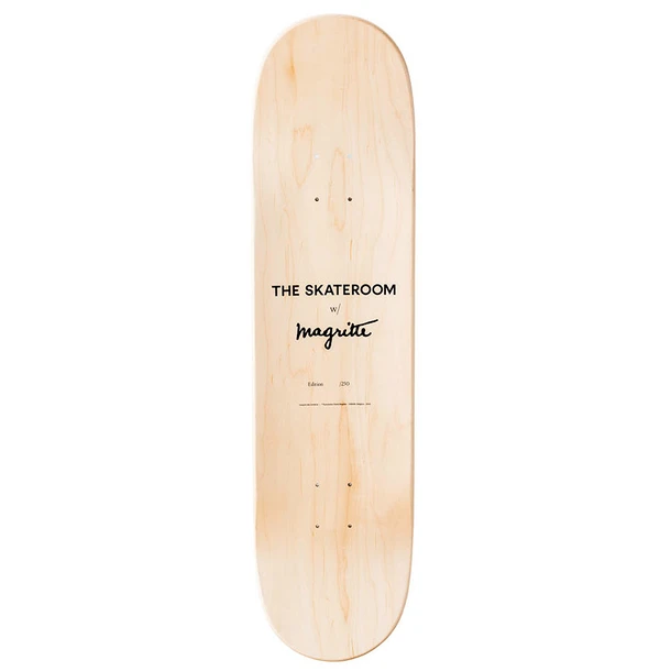 Ces skates sont réalisés en bois d’érable. Créé en étroite collaboration avec la Fondation Magritte, ce tryptique est considéré comme un hommage au père du surréalisme belge et comme une extension de son art à la planche à roulettes.