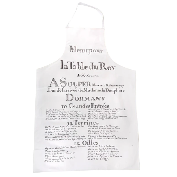 Ce tablier reproduit un parchemin de 1747, conservé à la Bibliothèque historique de Paris. Ce menu calligraphié détaille par chacun de ces cinq services, les six à huit plats présentés au roi. N’importe lequel de ses sujets pouvait venir voir manger le monarque sous condition d’être vêtu dignement et portant épée.