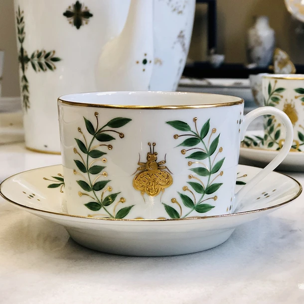 Tasse à thé en porcelaine de Limoges peinte à la main, dorée à l’or fin déposé en relief, dont le décor Empire est inspiré par Napoléon Ier, orné de l’abeille et des couronnes de lauriers emblématiques de ce style.