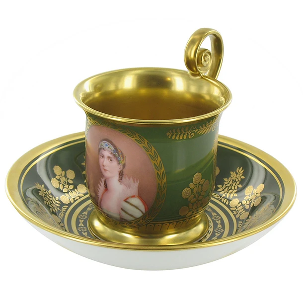 Cette tasse et soucoupe de forme « calice » marient la sévérité de la politique et le charme de l’impératrice. Pour l’élégance sévère, on constate la présence du vert Empire sur la face de la tasse, et la doublure d’or.
