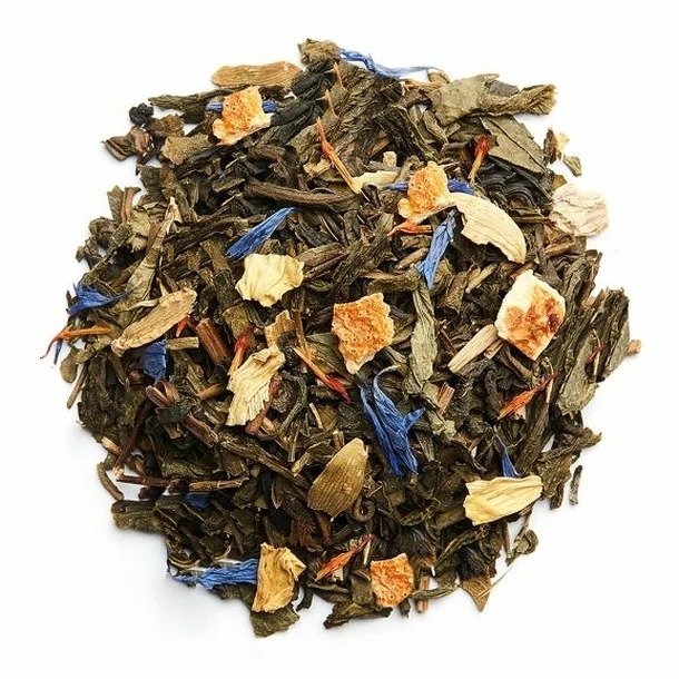 Ingrédients : Thé vert (Chine) (94%), arômes, pétales de fleurs (bleuet, tournesol, carthame)(1%), écorces de citron et d’orange (1%), cardamome, gingembre, fleur d’oranger