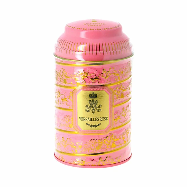 Dans cette boîte en métal rose décorée de dorures se cache le thé noir aromatisé Versailles Rose réalisé par Nina’s, maison de thé parisienne depuis 1672, spécialiste des parfums et arômes.
