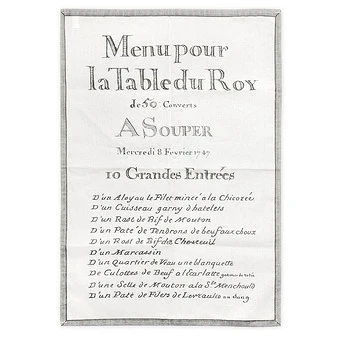 Ce torchon a été réalisé à partir du recueil « Voyages du Roi au château de Choisy, avec les logements de la cour et les menus de la table de Sa Majesté – Année 1747 », par Brain de Sainte-Marie.